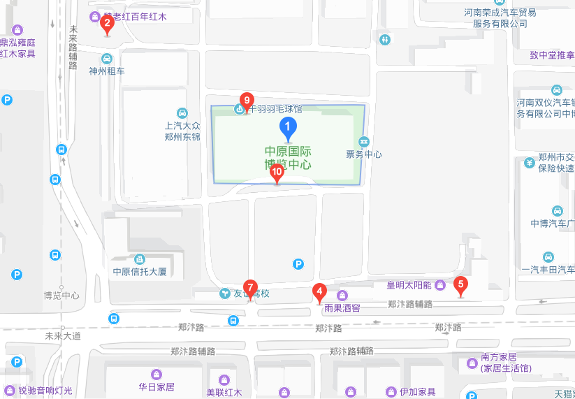 機(jī)場高速鄭州南出口下,沿中州大道北行至鄭汴路口向西轉(zhuǎn)上鄭汴路直行1.8公里即至中原國際博覽中心。