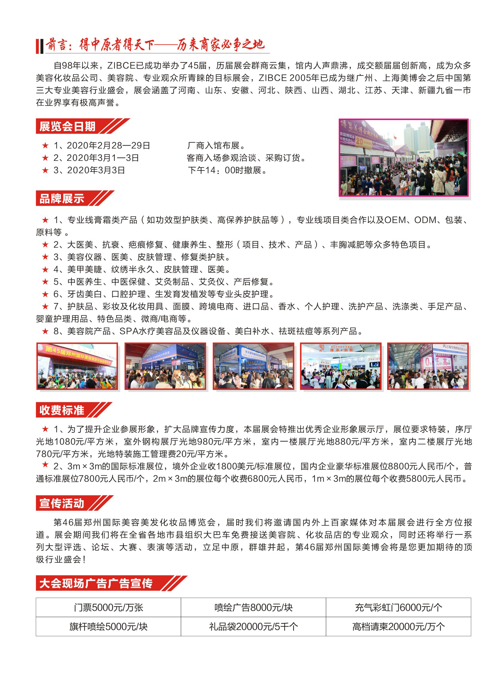 四、宣傳活動:第46屆鄭州國際美容美發(fā)化妝品博覽會,屆時我們將邀請國內(nèi)外上百家媒體對本屆展會進(jìn)行全方位報道。展會期間我們將在全省各地市縣組織大巴車免費(fèi)接送美容院、化妝品店的專業(yè)觀眾,同時還將舉行一系列大型評選、論壇、大賽、表演等活動,立足中原,群雄并起,第46屆鄭州國際美博會將是您更加期待的頂級行業(yè)盛會!