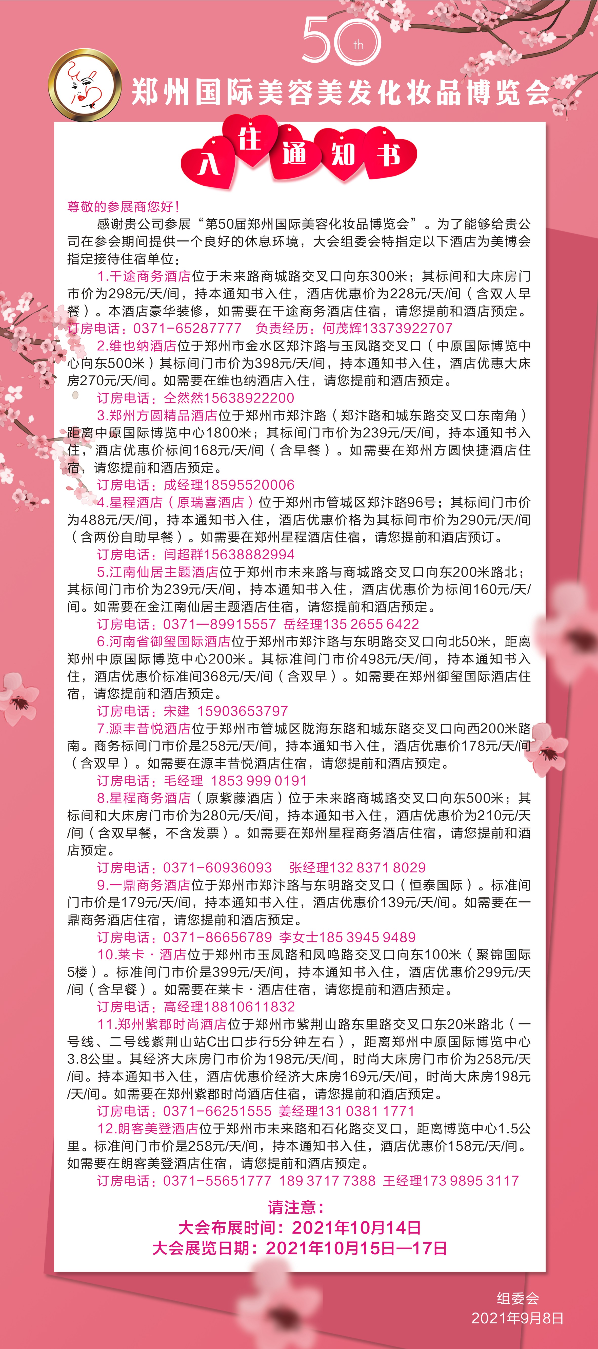 第50屆鄭州國際美容美發(fā)化妝品博覽會(huì)入住通知書